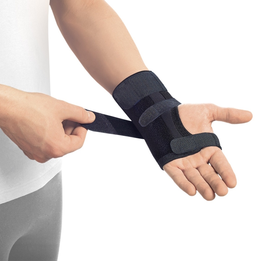 Бандаж П-1411 на лучезапястный сустав неопреновый с шиной. Обеспечивает полужесткую фиксацию и разгрузку запястья. Оказывает согревающее действие. Фиксирует дистальную треть предплечья и область кистевого сустава в функционально выгодном положении. Восстанавливает физиологическую ось предплечья. Осуществляет фиксацию лучезапястного, запястных, запястнопястных суставов в функционально выгодном положении, разгружает капсулы суставов.