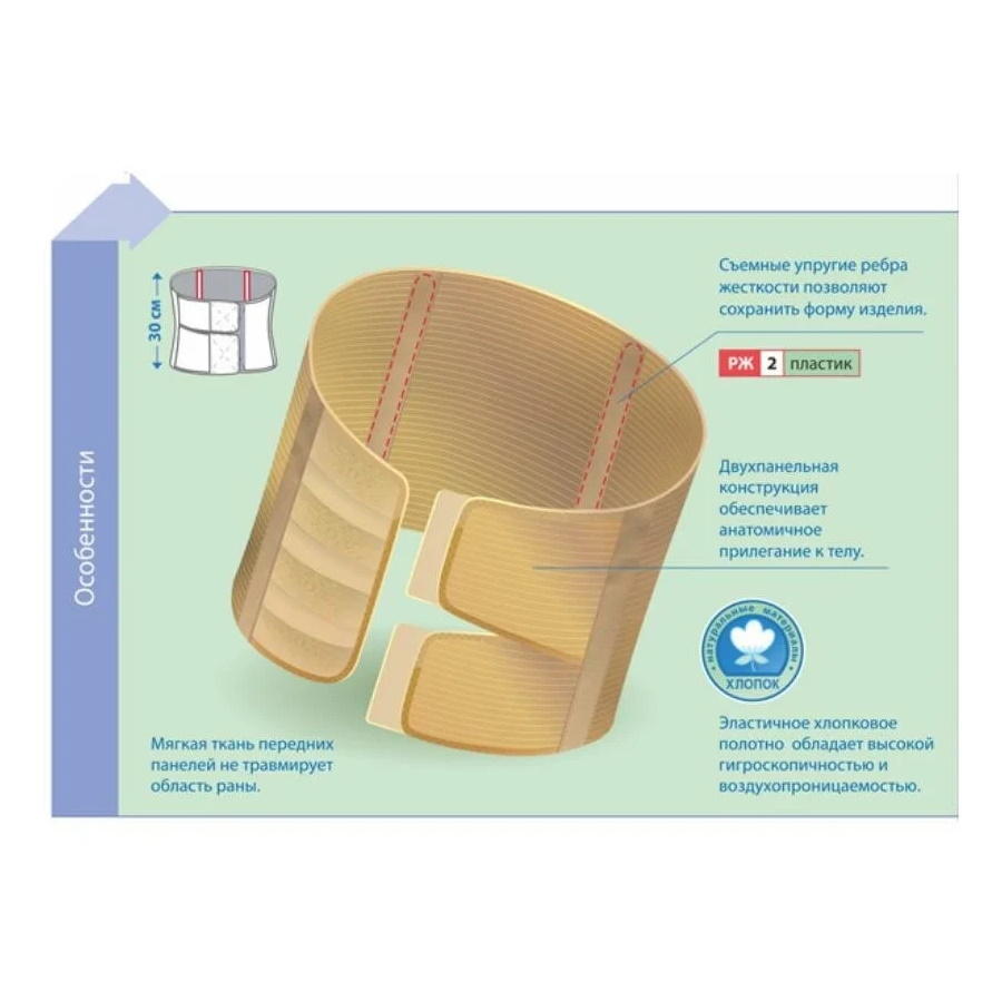 Передняя панель изготовлена из мягкого нерастяжимого материала, не травмирует область послеоперационной раны и способствует быстрому заживлению. Двухпанельная застежка облегчает надевание и обеспечивает анатомичное прилегание бандажа к телу.