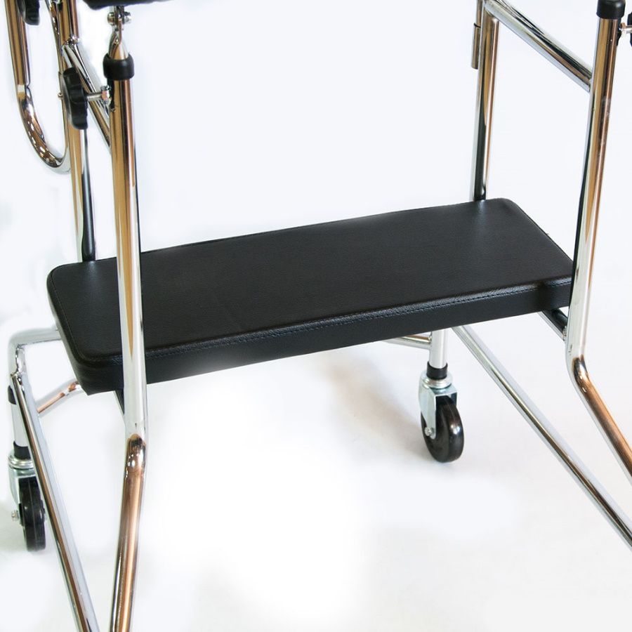 Ходунки PMR827 с опорой под локоть позволяют сохранять равновесие, улучшают координацию движений и уменьшают нагрузку на ноги. Благодаря подлокотной опоре, на которую ставятся локти и предплечья, снимается нагрузка с мышц и суставов ног. Рама ходунков изготовлена из стали с хромовым покрытием, сиденье и U-образная подлокотная опора выполены из эко-кожи. Легкость передвижения обеспечивается 4 колёсами, а для безопасности задние колеса оснащены стояночными тормозами.